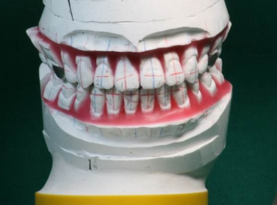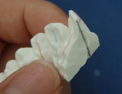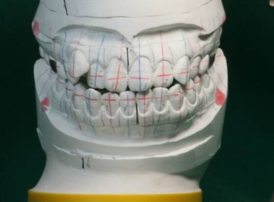 1 初診時のセットアップ模型を正中で分割し、その断面に歯軸のラインを引く。