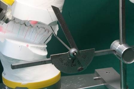 3 計測バーを記入した歯軸のラインに重ね、ゲージの角度を計測する。